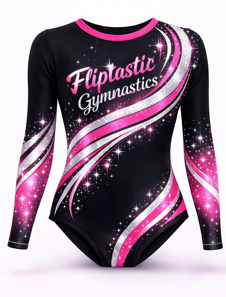 This stunning Fliptastic leotard is designed to stand out while providing maximum comfort and performance. Featuring a sleek black base with vibrant pink and shimmering silver swirls, it brings just the right amount of sparkle and elegance to every practice and performance. The long sleeves and secure crew neckline offer full coverage and a polished look, while the soft, flexible fabric allows for complete freedom of movement. Thoughtfully designed with discreet snap buttons at the bottom, it makes getting in and out quick and easy without compromising on fit.